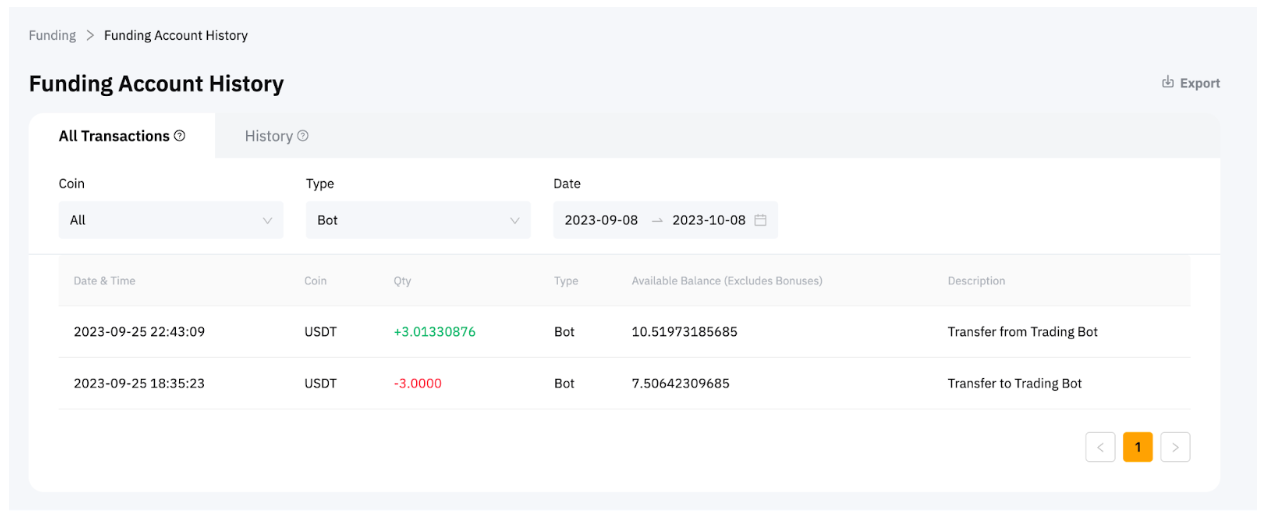 Click on Assets → Funding Account → History → Select Bot under the Type tab on the  All Transactions page.