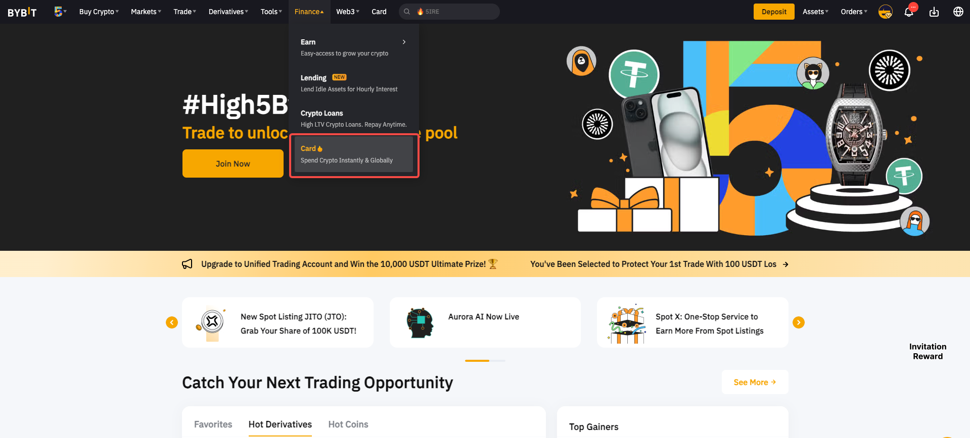 1: Navigate to the Bybit page's navigation bar, click on Finance, then select Card to enter the Bybit Card application page. Click on Learn More next to Lite Version Available to initiate your application for the Bybit Virtual Card Lite.