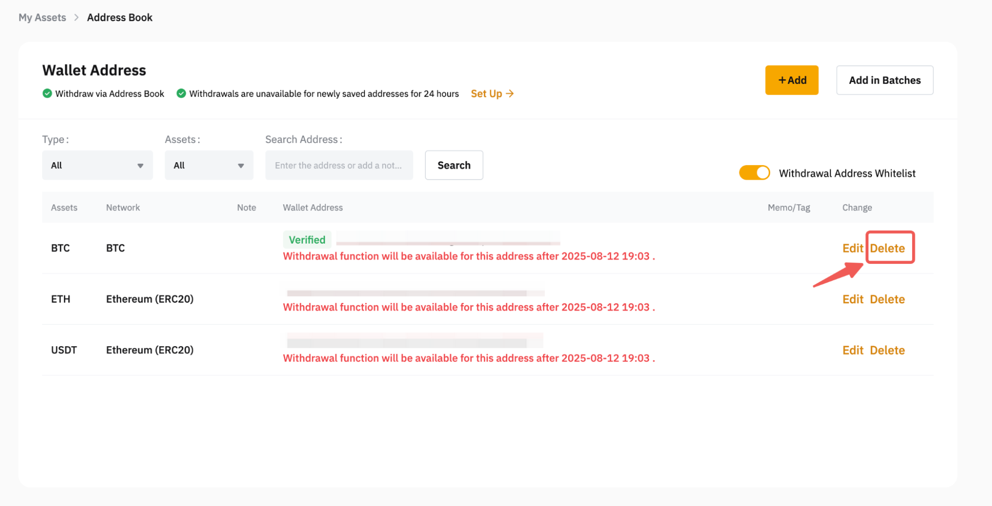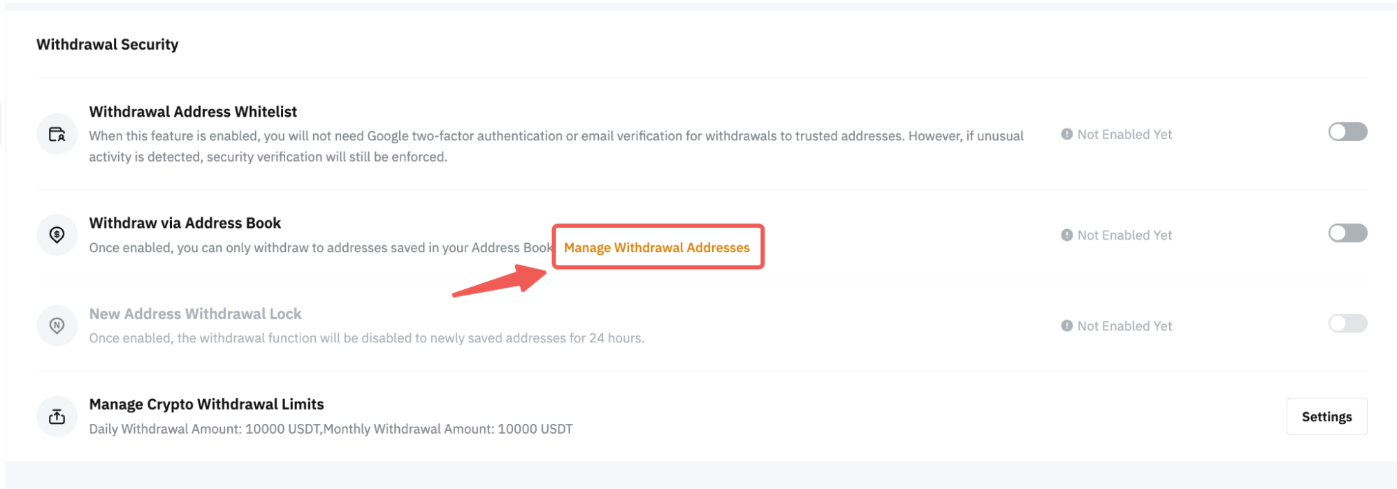 Para saques rápidos e convenientes, a Bybit tem vários recursos de segurança para ajudá-lo a manter e atualizar seu livro de endereços de saque. Esses recursos dão a você as opções para ajustar suas configurações de saque atuais, bem como verificar e excluir quaisquer endereços de saque, se necessário.