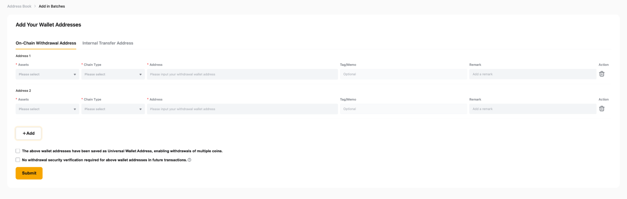 Se você quiser adicionar endereços de carteira em lotes para endereço de saques na rede/chain e endereços de transferência interna, observe o seguinte: