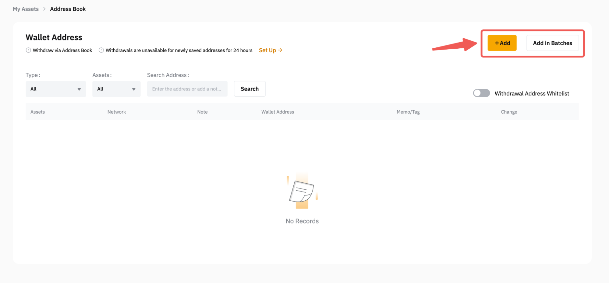 1. Depois de acessar a página Gerenciamento de carteiras, clique no botão Adicionar no canto superior direito da página para adicionar um novo endereço de carteira. Se quiser adicionar vários endereços ao mesmo tempo, clique em Adicionar em lotes.