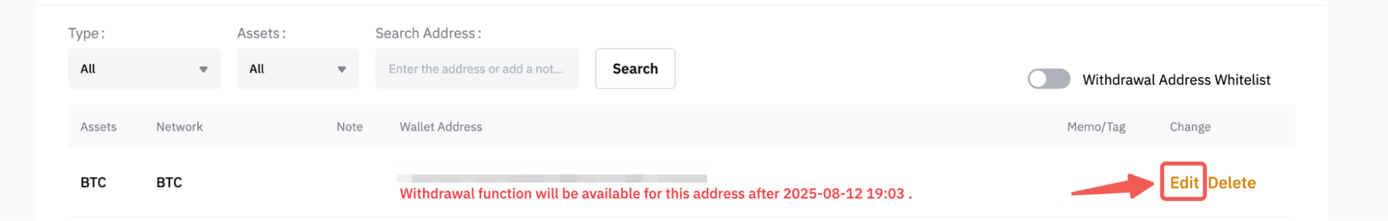 Se você ativou o recurso de segurança Bloqueio de saque de novo endereço, por exemplo, a função de saque ficará restrita por 24 horas para o endereço recém-salvo ou quando você desativar o recurso de segurança.
