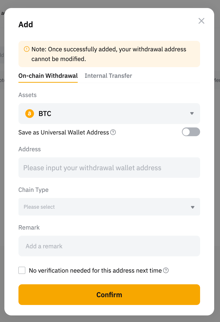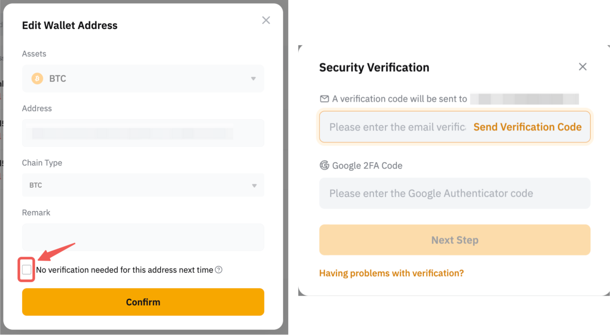 • Marque a caixa abaixo se desejar habilitar a função Salvar como endereço de carteira universal ou Não é necessária verificação para este endereço da próxima vez. No entanto, observe que a verificação de segurança também pode ser necessária se houver alguma atividade incomum detectada em sua conta.
