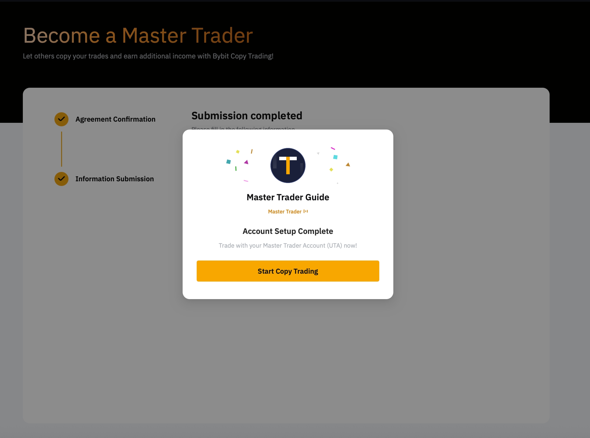 Upon successfully applying to be a Master Trader, it is required to complete the new Master Trader missions located within the Mission Center in order to be featured on the Bybit Copy Trading Recommended page.