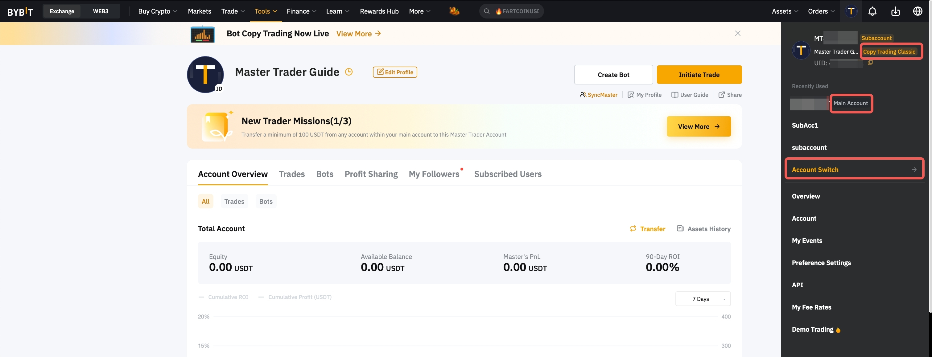 — To switch between your Main Account and Copy Trading Master Trader Account, hover your cursor over the profile icon and you will be able to see your recently used account. You will see a Copy Trading label beside the username for your Master Trader Subaccount. You can also click on Account Switch to view more Subaccounts.