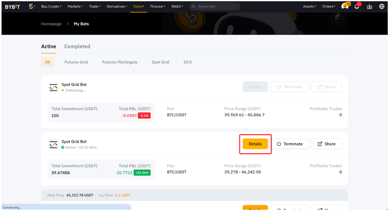 If you've previously created Bybit trading bots, you can view the Total Equity (USDT) and Current P&L (USDT) under My Bots in the upper right corner of the Bybit Trading Bot page.