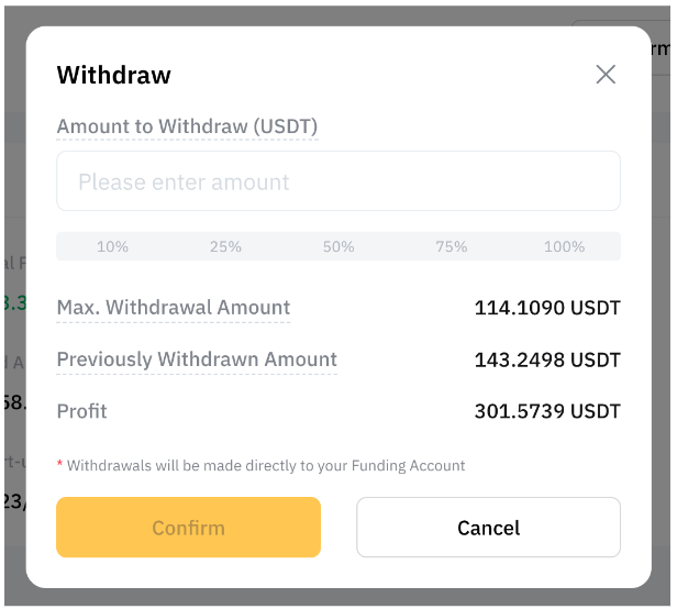 The maximum amount that can be withdrawn is your grid profit after the fee deduction. You can refer to the Max. Withdrawal Amount displayed on the withdrawal window. The withdrawn amount will be credited to your Funding Account.