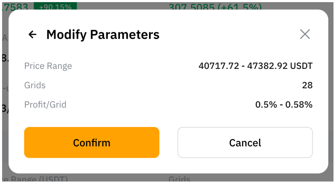 Step 2: Modify your Price Range, Grids, or TP/SL. Additional investment amounts or a modified buy or sell quantity of the base token may be required to meet the new parameters.