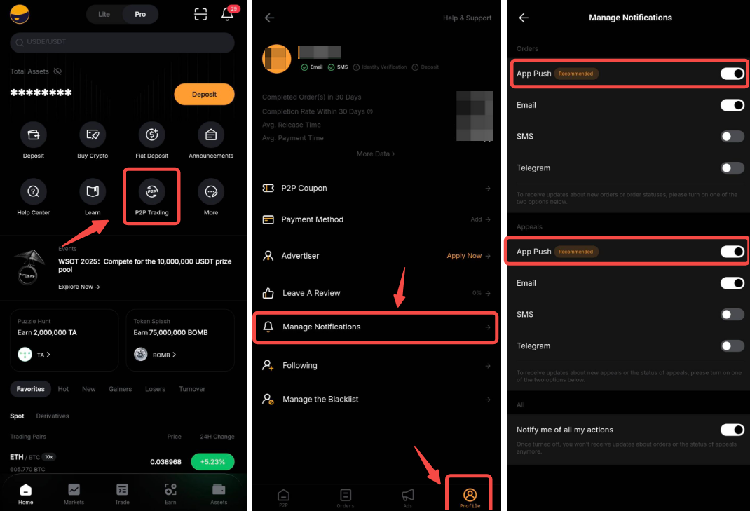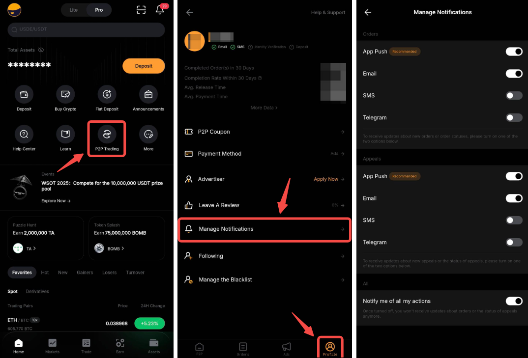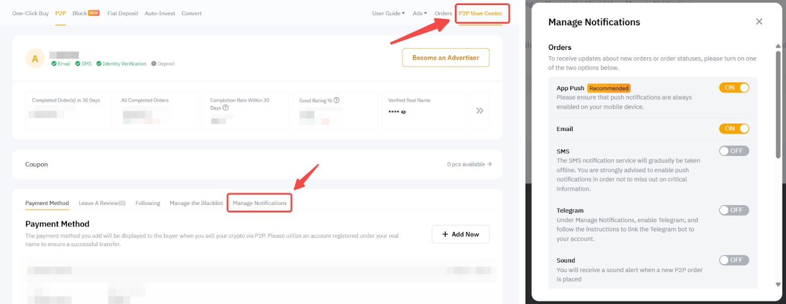 You can control the notifications such as App push, Telegram, email and SMS for P2P orders and appeals through the P2P User Center