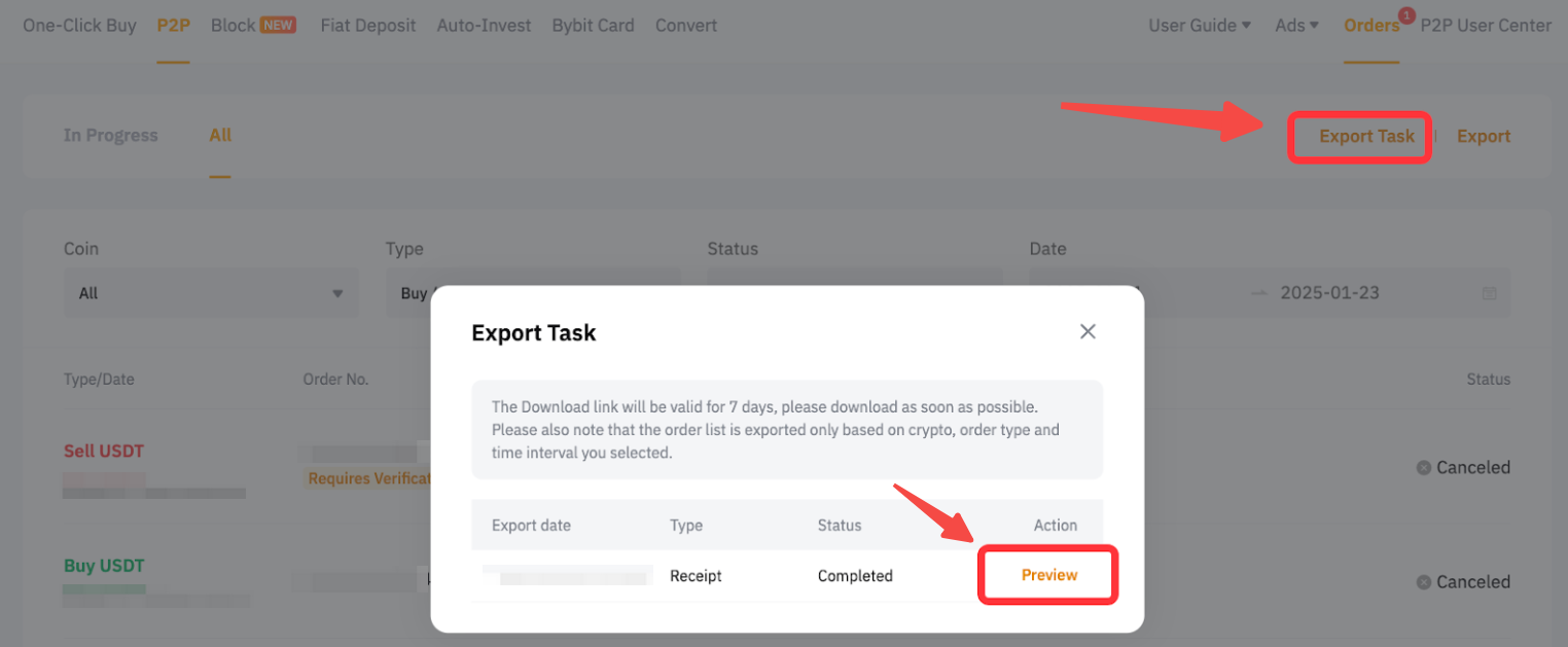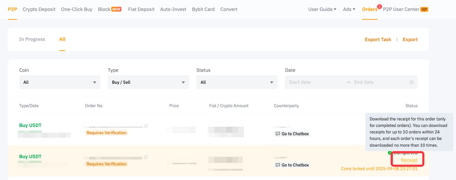 You can export information about your P2P orders by clicking on the Export button in the upper right corner of this page. Please note that the Export function is available only on the Bybit website.