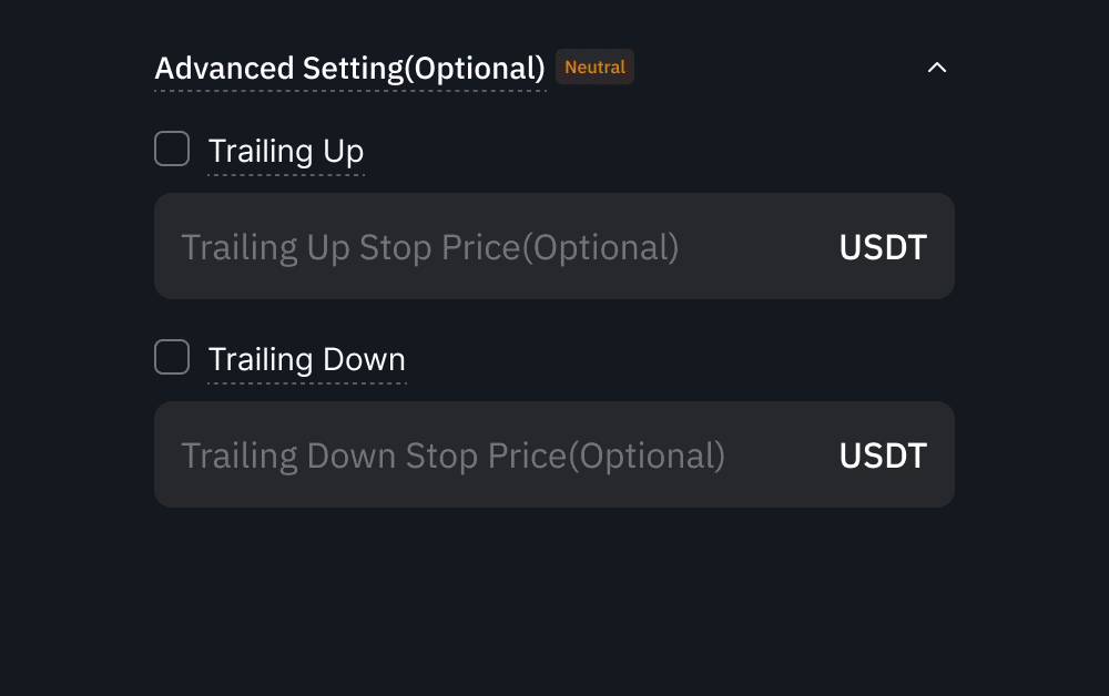 — В настоящее время функции восходящего/нисходящего трейлинга доступны только для фьючерсного grid-бота в нейтральном, лонг- и шорт-направлениях.