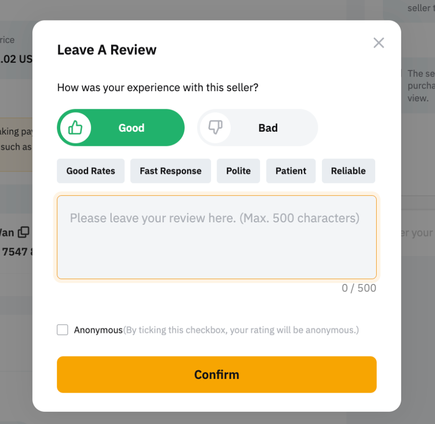 Шаг 2: Помимо оценки, функция P2P-отзывов позволяет оставить комментарий о вашем контрагенте. Вы можете оставлять отзывы анонимно — ваши контрагенты не узнают, кто их отправил. Для отправки отзыва нажмите Подтвердить после завершения написания.