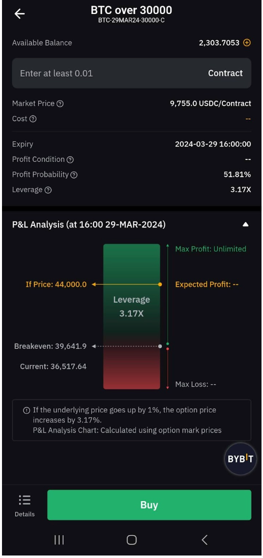На наведеному нижче графіку аналізу прибутків і збитків представлено поточну ринкову ціну, прибутки й збитки, змодельовані на основі ціни маркування, точку беззбитковості та оптимальні ситуації PnL під час моделювання. Переглянувши деталі, трейдери можуть натиснути «Купити», щоб придбати контракт.