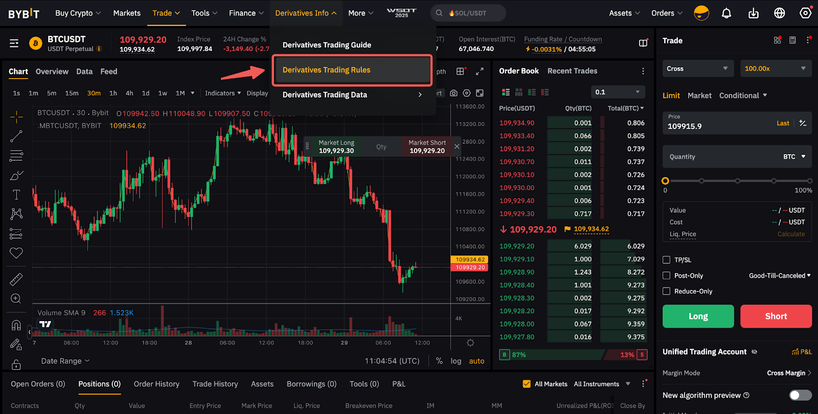 - Якщо Боб має лонг-позицію на 1 BTC вартістю $40 000 і шорт-позицію 1 BTC вартістю $50 000 у контрактах BTCUSDT, одночасно має 0,5 BTC з вартістю ордера $15 000 відкритих лонг-ордерів, 1 BTC з вартістю ордера $60 000 відкритих шорт-ордерів у контрактах BTCUSDT, значення ліміту ризику обчислюється як Макс (40 000 + 15 000, 50 000 + 60 000) = $110 000.