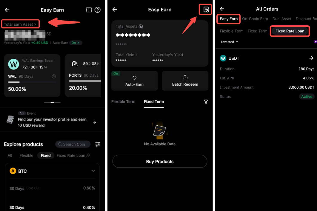 Nếu bạn đang truy cập qua web, hãy truy cập Lệnh → Earn → Sinh Lời Dễ Dàng → Vay Lãi Cố Định để kiểm tra lệnh cung của bạn.