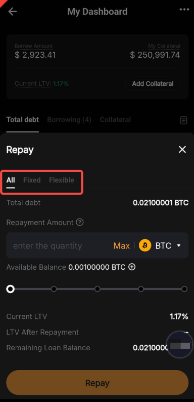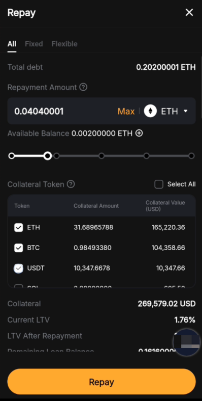 Có, hiện đã có hỗ trợ hoàn trả bằng ký quỹ. Bạn có thể chọn nhiều loại tài sản đảm bảo cho Khoản Vay Tỷ Lệ Linh Hoạt và Khoản Vay Lãi Cố Định. Tỷ lệ chuyển đổi sẽ được tính dựa trên Giá Chỉ Số của cả tài sản ký quỹ và tài sản nợ.