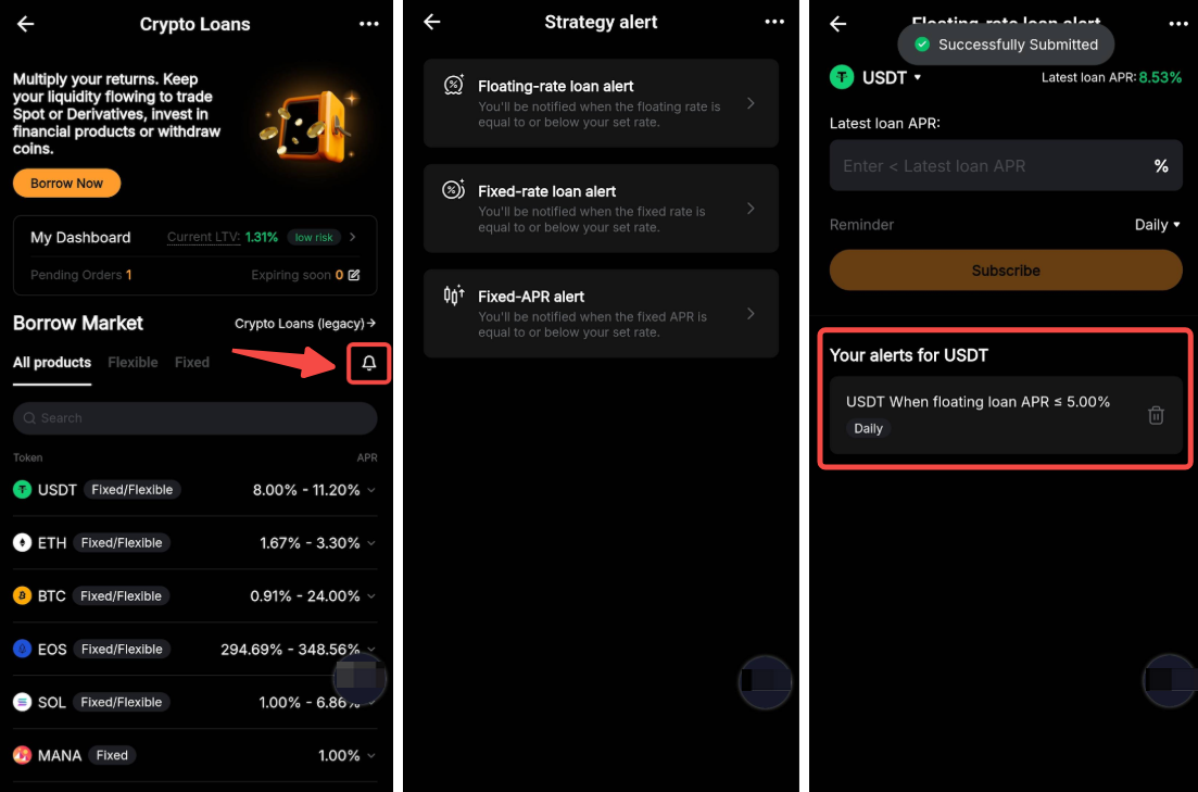Có, bạn có thể đặt thông báo chiến lược cho các Khoản Vay Crypto bằng cách đăng nhập vào Bybit App, điều hướng đến Cho Vay Crypto, nhấn vào biểu tượng chuông, chọn loại thông báo ưa thích của bạn (Tỷ Lệ Trượt, Tỷ Lệ Cố Định hoặc APR Cố Định), chọn coin và đặt tỷ lệ để nhận thông báo khi tỷ lệ đáp ứng hoặc giảm xuống dưới mục tiêu của bạn.