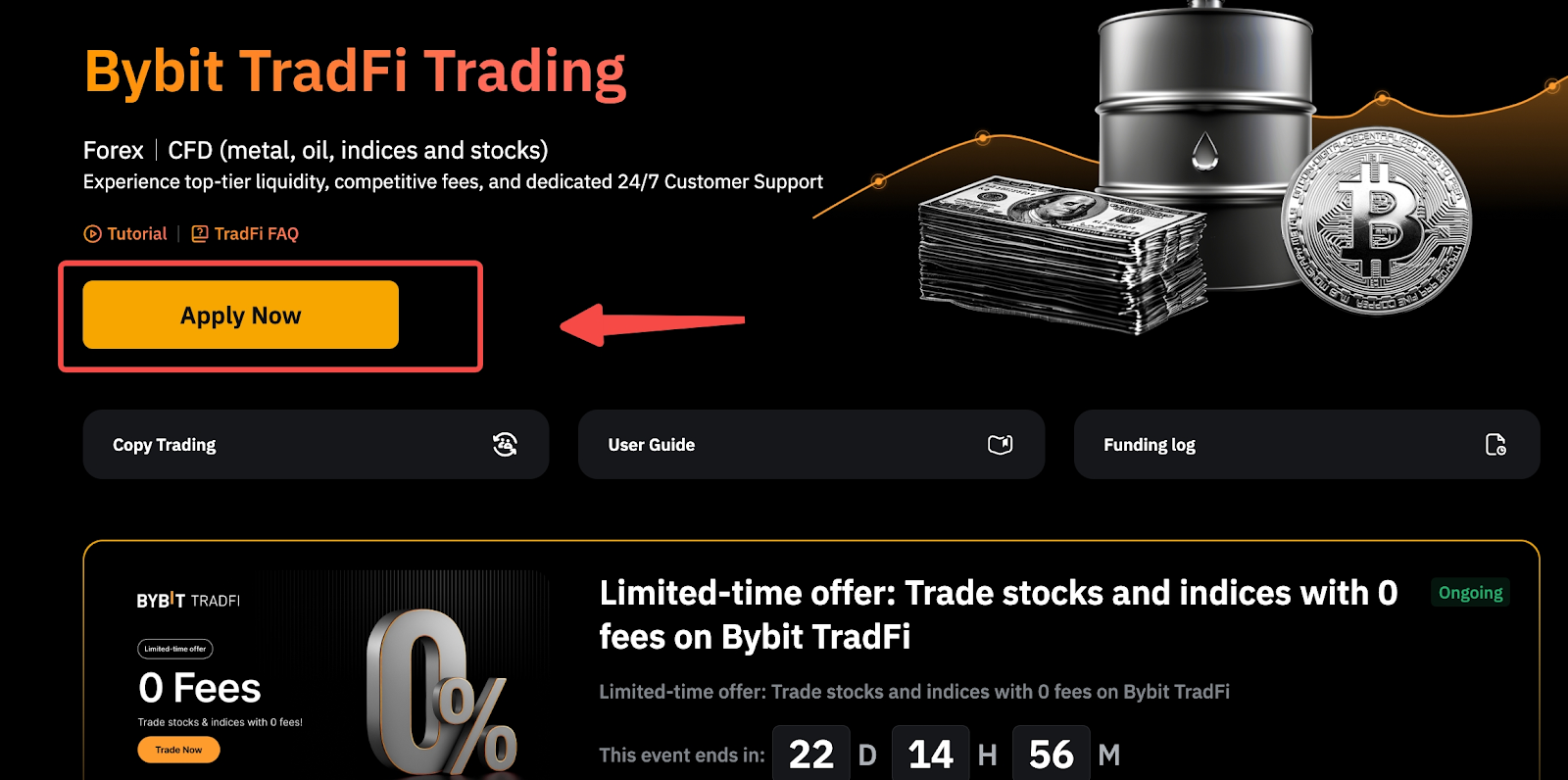 Bybit hân hạnh giới thiệu sản phẩm TradFi mới, hiện đã có sẵn trực tiếp trên website của chúng tôi. Với TradFi, bạn có thể tiếp cận đa dạng các sản phẩm CFD, bao gồm FX, Kim loại, Chỉ số, Dầu, Hàng hóa và CFD Cổ phiếu Mỹ.