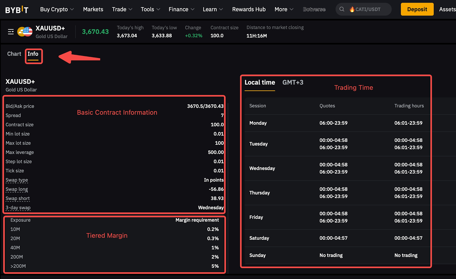 Bạn có thể xem các biểu đồ và chi tiết tài khoản trực tiếp trên trang giao dịch và kiểm tra thông số kỹ thuật của hợp đồng bằng cách nhấp vào nhãn [Thông tin].