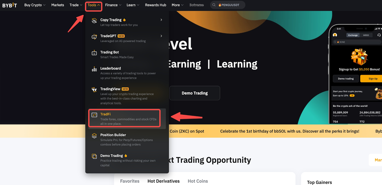 Bước 1: Đăng nhập vào tài khoản Bybit của bạn và di lời nguyền của bạn qua Công cụ trên thanh điều hướng, sau đó nhấp vào TradFi.