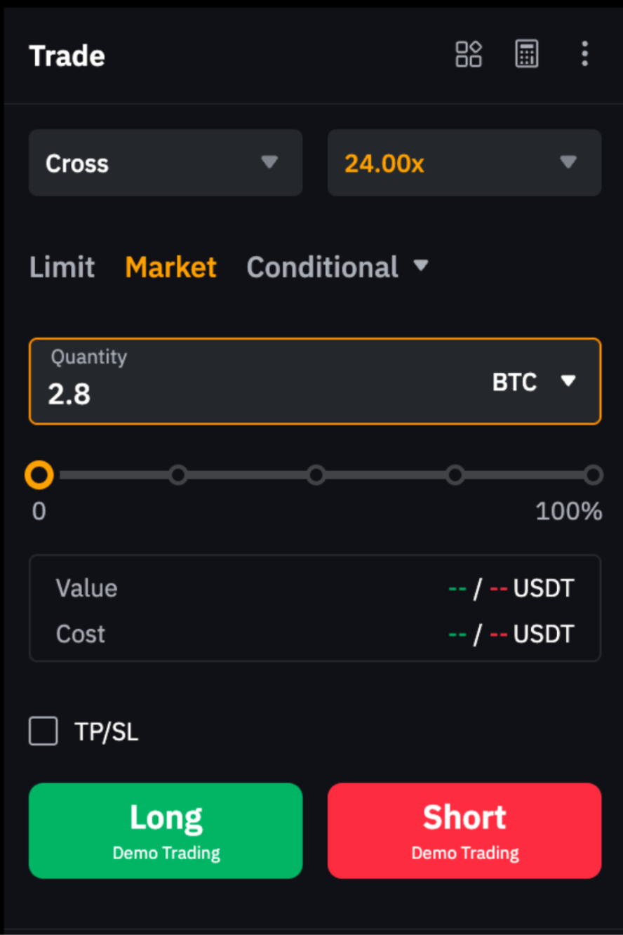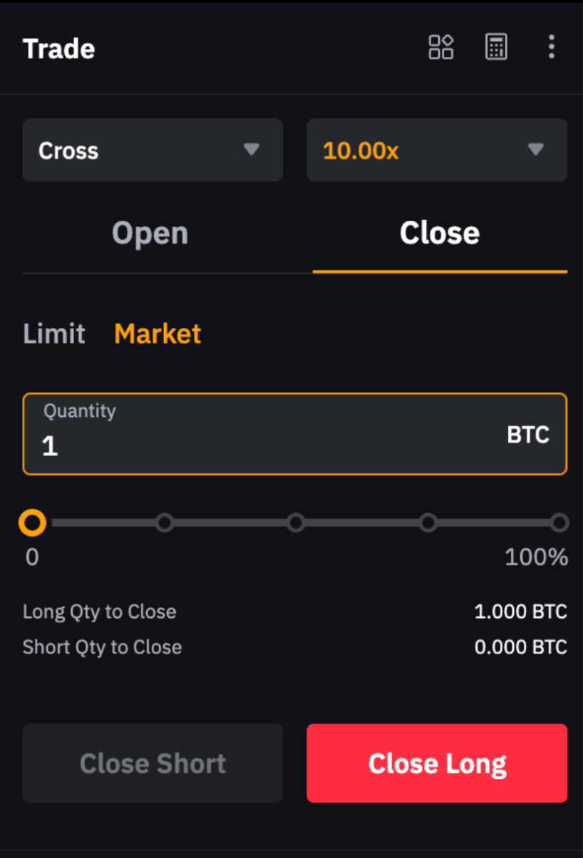 Ví dụ, để đóng vị thế mua/long 1 BTC, hãy đặt lệnh thị trường bán short 1 BTC. Lưu ý, nếu số lượng lệnh vượt quá kích thước vị thế hiện tại của bạn, một vị thế mới theo hướng ngược lại có thể được mở.