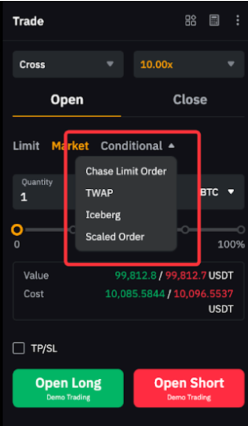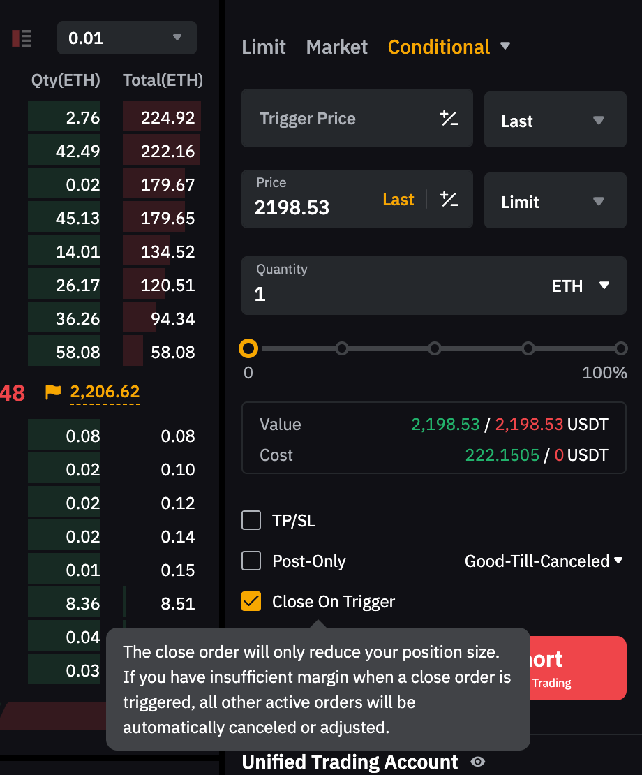 Lưu ý: Nếu số lượng lệnh vượt quá kích thước vị thế hiện tại của bạn, một vị thế mới theo hướng ngược lại có thể được mở. Để tránh điều này, bạn có thể bật Chỉ Giảm với lệnh giới hạn, hoặc Đóng Khi Kích Hoạt với lệnh điều kiện.
