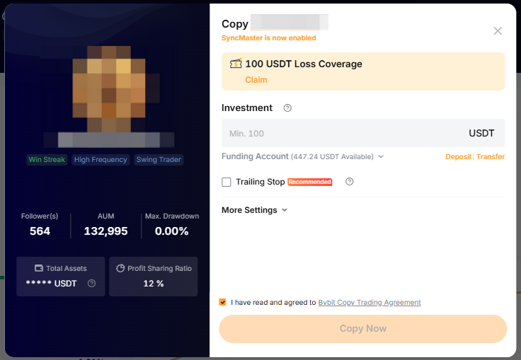 投资额 | 这是您复制该交易达人所需投资的总金额。您可以根据您的Bybit帐户余额输入金额,也可以选择使用哪个帐户余额,例如统一交易账户、资金帐户等。 一般情况下,跟单最低金额为100 USDT。然而,交易达人可能会建议或强制他的跟单用户同步复制他所需的最低资金。 |