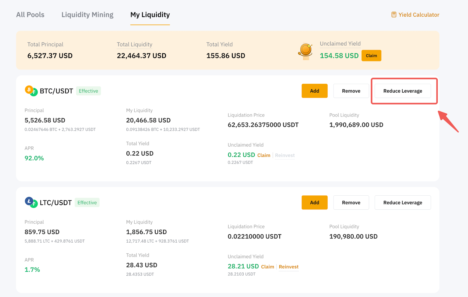 第一步:前往我的流動性頁面,點擊更多 –> 降低槓桿,進入降低槓桿頁面。