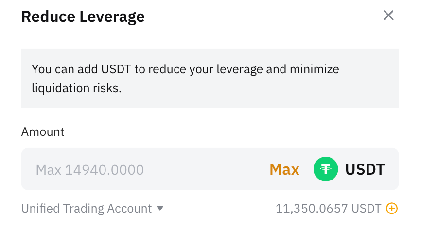 請注意,您可以追加的 USDT 最大金額屬於槓桿貸款的一部分。 當您添加最大金額時,您的倉位槓桿將降低至 1 倍。